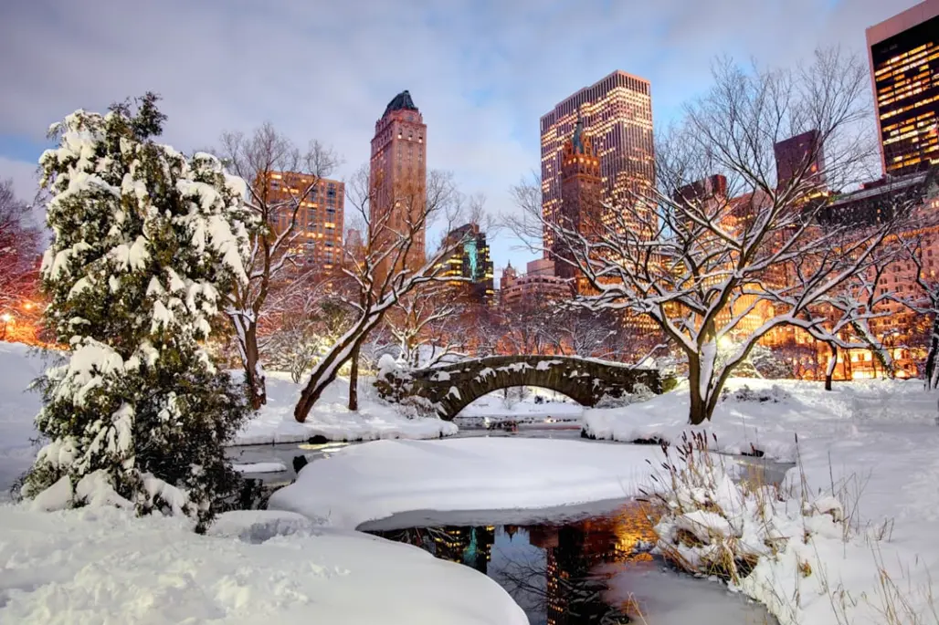 Khi mùa đông về, Central Park trở thành một thiên đường của cảnh quan mùa đông. Hồ nước trong trung tâm công viên đóng băng, phản chiếu các tán cây phủ tuyết trắng như những bức tranh thủy mặc của nghệ thuật Nhật Bản. Những cánh cây, bụi cỏ, hay hàng rào bao quanh đều đắm chìm trong lớp tuyết mịn, mang lại cảm giác thanh bình, thơ mộng.