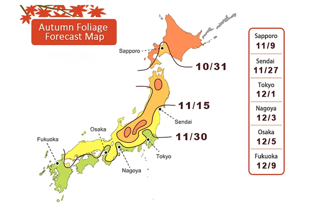 Để thuận tiện cho du khách sắp xếp lịch trình du lịch Nhật Bản mùa thu, các bản đồ dự báo mùa lá chuyển màu theo khu vực đã được cập nhật liên tục. Hokkaido, vùng cực bắc của Nhật, bắt đầu khoe sắc sớm nhất, từ cuối tháng 9 đến đầu tháng 10. Tiếp đó là vùng Tōhoku, trung tâm của các tỉnh như Aomori, Akita, và Yamagata – vào cuối tháng 10.