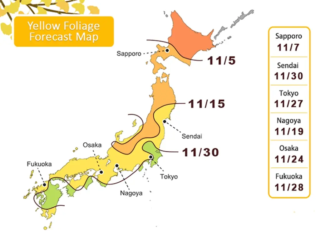 Các vùng cao nguyên và phía Bắc Nhật Bản thường bắt đầu chuyển màu sớm nhất, trong khi các vùng ven biển phía Nam hoặc thành phố như Tokyo, Osaka có thể trễ hơn khoảng 1-2 tuần. Các cộng đồng địa phương hoặc tour Nhật mùa thu thường cập nhật dự báo chuyển màu của lá để du khách có thể lên kế hoạch phù hợp. Thời điểm lý tưởng để ngắm lá vàng Kyoto thường bắt đầu từ khoảng giữa tháng 11, còn ở Hokkaido từ cuối tháng 9 đến đầu tháng 10.