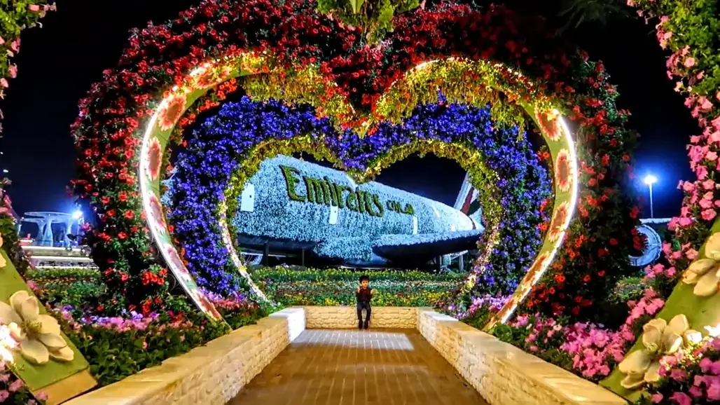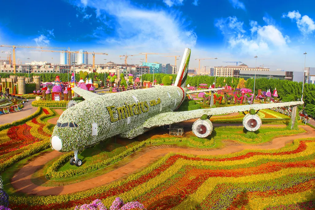 Một trong những điểm nhấn nổi bật chính là máy bay hoa Emirates A380 – chiếc máy bay lớn nhất thế giới được phủ đầy hoa, tượng trưng cho sự đẳng cấp của hàng không Dubai. Công trình này không chỉ gây ấn tượng bởi kích thước khổng lồ mà còn bởi chi tiết hàng trăm nghìn đóa hoa được gắn kết khéo léo nhằm tạo hình dáng của chiếc Boeing A380. Đặc biệt, công trình này đã chính thức ghi vào sách kỷ lục Guinness thế giới, trở thành biểu tượng của sáng tạo và tinh thần vươn xa của đất nước Dubai.