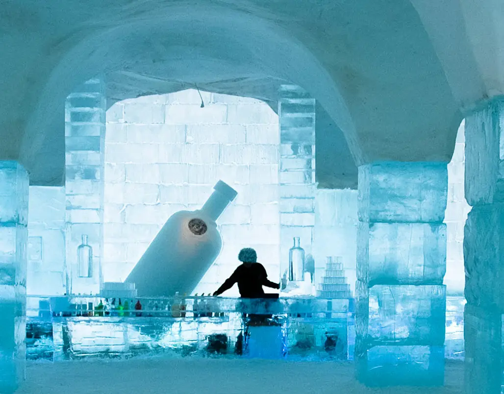 Một trong những trải nghiệm ấn tượng nhất là bar băng, nơi mọi vật dụng – từ ly, bàn đến quầy pha chế – đều được làm từ băng nguyên chất. Trong ánh sáng xanh mờ ảo, thưởng thức một ly cocktail lạnh buốt giữa khung cảnh băng tuyết là cảm giác khó quên. Không gian này cũng là sân khấu sáng tạo của các nghệ nhân điêu khắc, mang đến trải nghiệm vừa nghệ thuật vừa thư giãn, khép lại hành trình mùa đông Bắc Âu đầy cảm hứng.