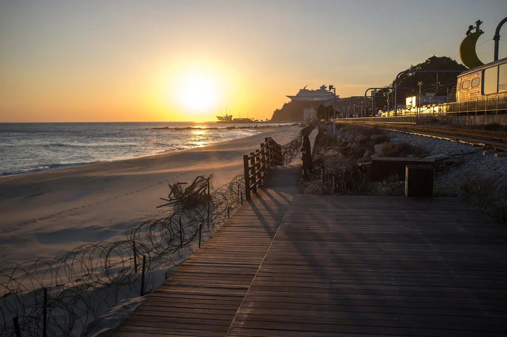 Jeongdongjin được mệnh danh là “thiên đường bình minh” của Hàn Quốc nhờ vị trí giao hòa giữa núi và biển, mang đến góc nhìn hoàn hảo khi mặt trời mọc. Khi ánh sáng đầu tiên xuất hiện, cả không gian rực lên sắc vàng cam rực rỡ – khoảnh khắc mà ai từng chứng kiến đều khó quên.
