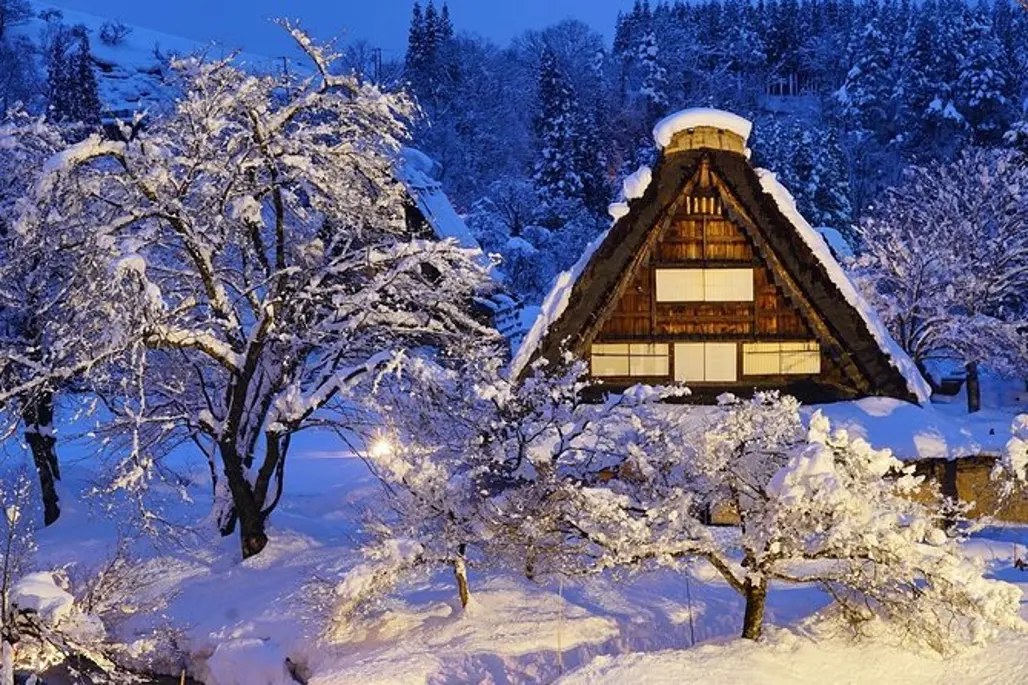 Khi mặt trời bắt đầu lặn, làng Shirakawa-go mùa đông khoác lên mình chiếc áo đêm huyền bí, từng mái nhà phủ tuyết trắng trở nên lung linh, phản chiếu ánh sáng của đèn lồng và đèn pin, tạo nên bức tranh mê hoặc. Không khí trong lành, se lạnh cùng vẻ đẹp huyền ảo này khiến du khách cảm thấy như đang lạc vào câu chuyện cổ tích vô tận. Màu trắng của tuyết hòa quyện với ánh sáng vàng, tạo cảm giác bình yên và tràn đầy cảm xúc.