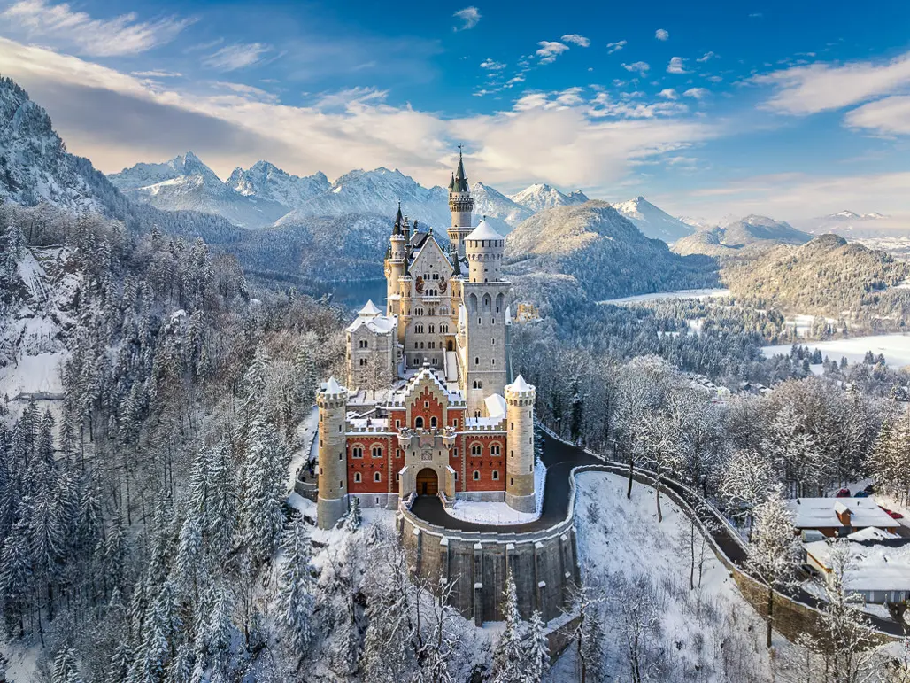 Lâu đài Neuschwanstein nằm trên dãy núi Alpes Bavarian, nổi bật trong các lâu đài phủ tuyết châu Âu với kiến trúc theo phong cách thần thoại, trông như bước ra từ câu chuyện cổ Grimm. Khi mùa đông đến, nơi đây khoác trên mình lớp áo trắng tinh khôi, hòa quyện cùng núi cao, rừng tuyết phủ xung quanh, tạo thành một khung cảnh quyến rũ đến khó cưỡng.