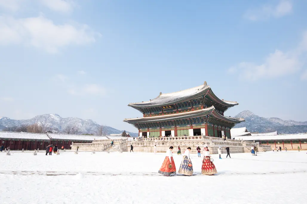 Bắt đầu chuyến hành trình đón chào năm mới bằng việc đến thăm cung điện Gyeongbokgung - một trong những biểu tượng lịch sử và văn hoá của Seoul. Trước thềm năm mới, khí hậu se lạnh, cảnh vật của cung điện trở nên yên bình hơn, phù hợp để du khách tham quan và chụp ảnh lưu niệm. Điều đặc biệt là vào lịch trình đầu năm, các cung điện thường mở cửa sớm hơn để đón khách, thể hiện mong muốn của người dân Hàn Quốc về một năm mới bình an, thịnh vượng. Tham quan cung điện Gyeongbokgung cũng giúp du khách hiểu rõ hơn về truyền thống và lịch sử của đất nước, góp phần làm phong phú trải nghiệm du lịch du lịch Hàn Quốc Tết.