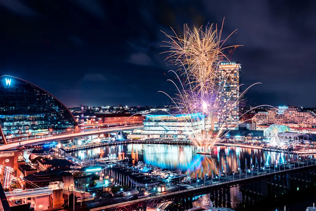 Dù không phải vị trí đối diện kinh điển như quanh cầu cảng, Darling Harbour lại rất phù hợp với nhóm gia đình nhờ không khí vui vẻ, nhiều dịch vụ ăn uống và thường có pháo hoa lúc 9pm lẫn nửa đêm trong dịp năm mới.