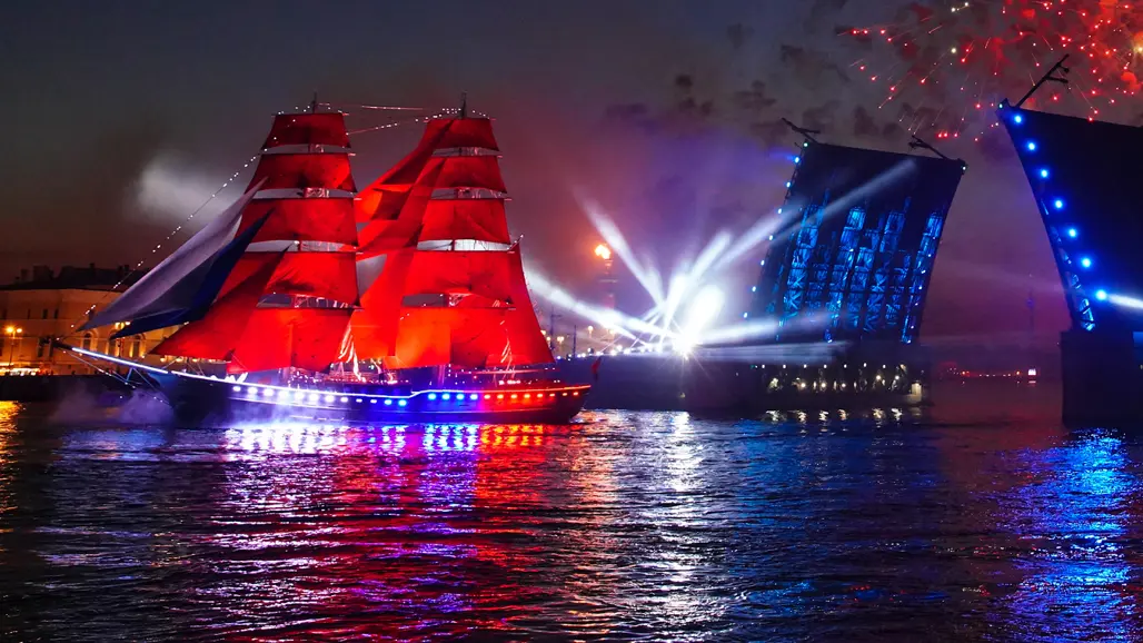 Saint Petersburg nổi tiếng với hiện tượng “Đêm Trắng” thời điểm bầu trời gần như không tối hẳn, tạo nên không gian mờ ảo, thơ mộng suốt đêm. Khi con thuyền buồm đỏ xuất hiện giữa ánh sáng đặc trưng ấy, toàn bộ khung cảnh trở nên cực kỳ điện ảnh và khó quên đối với du khách.