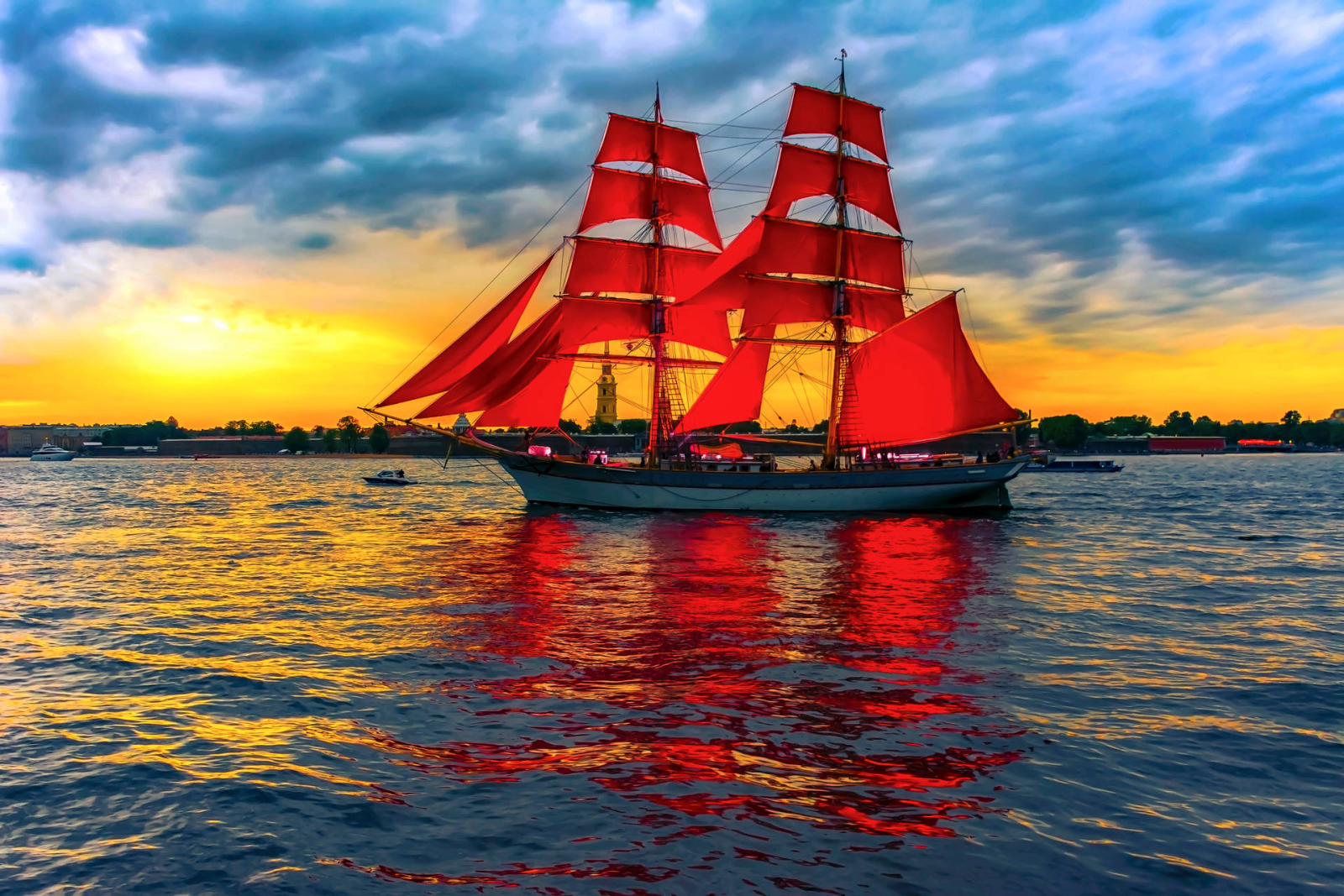 Điểm nhấn nổi tiếng nhất của lễ hội chính là màn xuất hiện của con tàu mang cánh buồm đỏ trên sông Neva. Đây là phần được chờ đợi nhất trong đêm, tạo nên cảm giác như một cảnh phim bước ra đời thực. Khi tàu tiến vào không gian trung tâm thành phố, kết hợp cùng ánh sáng sân khấu, pháo hoa và nền trời mùa Bạch Dạ, toàn bộ khung cảnh mang lại cảm giác rất điện ảnh và khó quên.