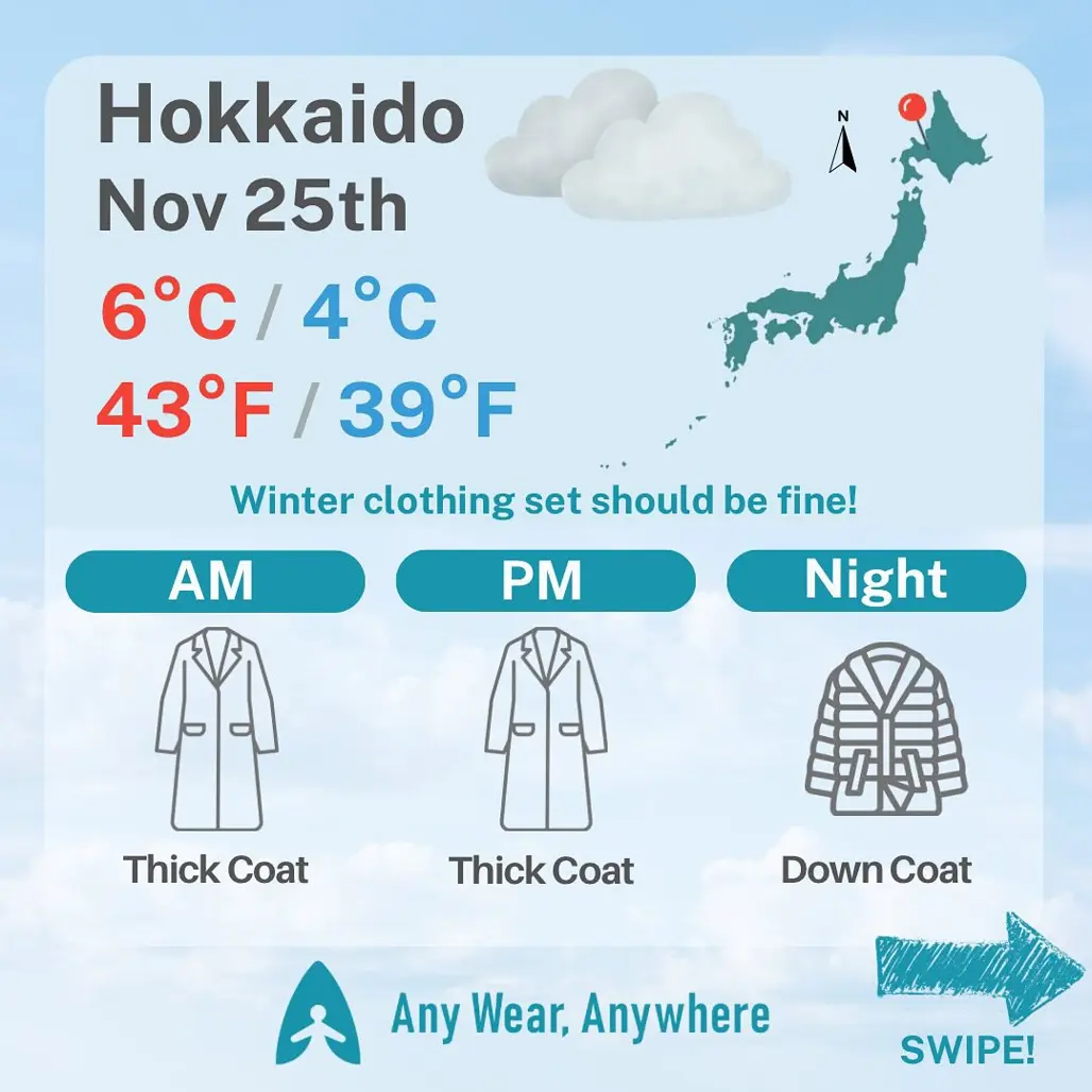 Khi đến Nhật vào mùa lạnh, áo khoác dày, áo len, áo phao, khăn quàng, găng tay, mũ len là những món đồ không thể thiếu. Bạn nên mang thêm lớp quần áo giữ nhiệt và miếng dán ấm để tiện di chuyển ngoài trời. Ưu tiên trang phục chống gió, chống nước, dễ phối và thoải mái khi tham quan cả ngày.