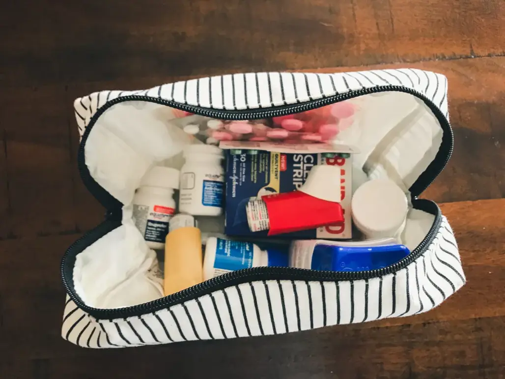 Trong hành lý của bạn không thể thiếu các loại thuốc cần thiết để xử lý các tình huống phát sinh như cảm lạnh, cảm cúm, đau đầu, đau bụng hoặc dị ứng. Thuốc cảm, thuốc hạ sốt, vitaminC, viên ngậm giữ ẩm cổ họng và thuốc nhỏ mắt là những sản phẩm nên luôn trong túi xách của bạn.