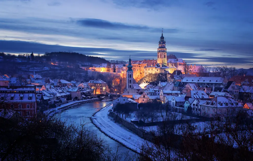 Nằm bên dòng sông Vltava, lâu đài Český Krumlov là một trong những lâu đài phủ tuyết đẹp nhất của Cộng hòa Séc. Khi mùa đông tới, toàn bộ khu phố cổ quanh cầu và các lâu đài cổ như chìm trong màn sương trắng, tạo nên khung cảnh như trong truyện cổ tích. Không gian này phù hợp để check-in, chụp hình trong những bộ trang phục cổ điển, hòa mình vào vẻ đẹp huyền bí, lãng mạn của châu Âu thời trung cổ.