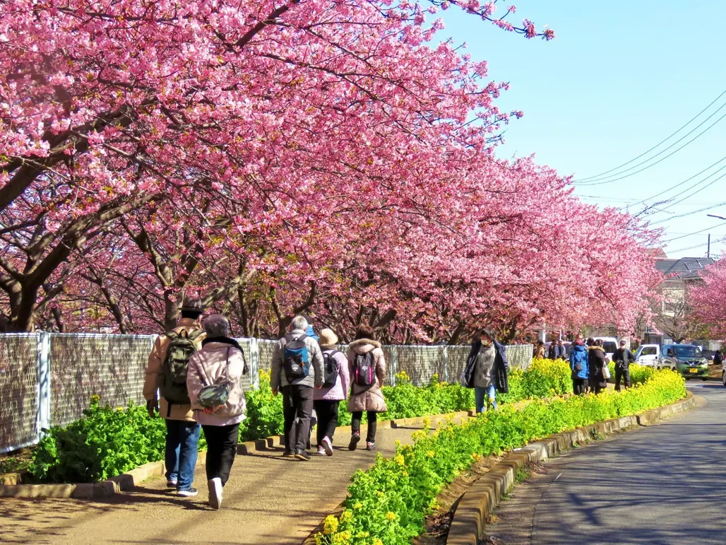 Thông thường, Kawazu bắt đầu nở từ cuối tháng 1 đến đầu tháng 2, sớm hơn ít nhất 1 tháng so với các loại sakura phổ biến như Yoshino hoặc Somei. Thời tiết ấm dần đều vào tháng 2 giúp thúc đẩy quá trình nở hoa, tạo điều kiện cho du khách có thể thưởng thức cảnh đẹp sớm nhất trong năm.
