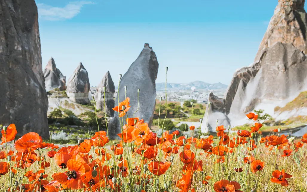 Tháng 4 là thời điểm các loài hoa bắt đầu đua nhau khoe sắc trên khắp các cao nguyên Cappadocia. Những cánh hoa anh đào, hoa mận, hoa hồng, và các loại hoa dại khác nở rộ, làm nổi bật lên vẻ đẹp kỳ vĩ của cảnh quan đá núi lửa, tạo nên một bức tranh đầy màu sắc và sống động. Không chỉ là cảnh quan, hoa xuân còn mang ý nghĩa tượng trưng cho sự đổi mới, khởi đầu mới, phù hợp với cảm xúc của mùa xuân Thổ Nhĩ Kỳ.