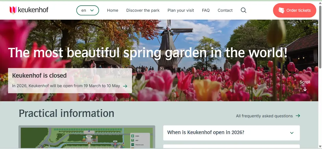 Lịch mở cửa bắt đầu từ khoảng cuối tháng 3 hoặc đầu tháng 4, tùy theo thời tiết và điều kiện khí hậu trong năm. Thời điểm này rất phù hợp cho du lịch Hà Lan mùa xuân, gồm cả việc ghé thăm các địa danh khác, kết hợp với tour Châu Âu cùng gia đình hoặc bạn bè.