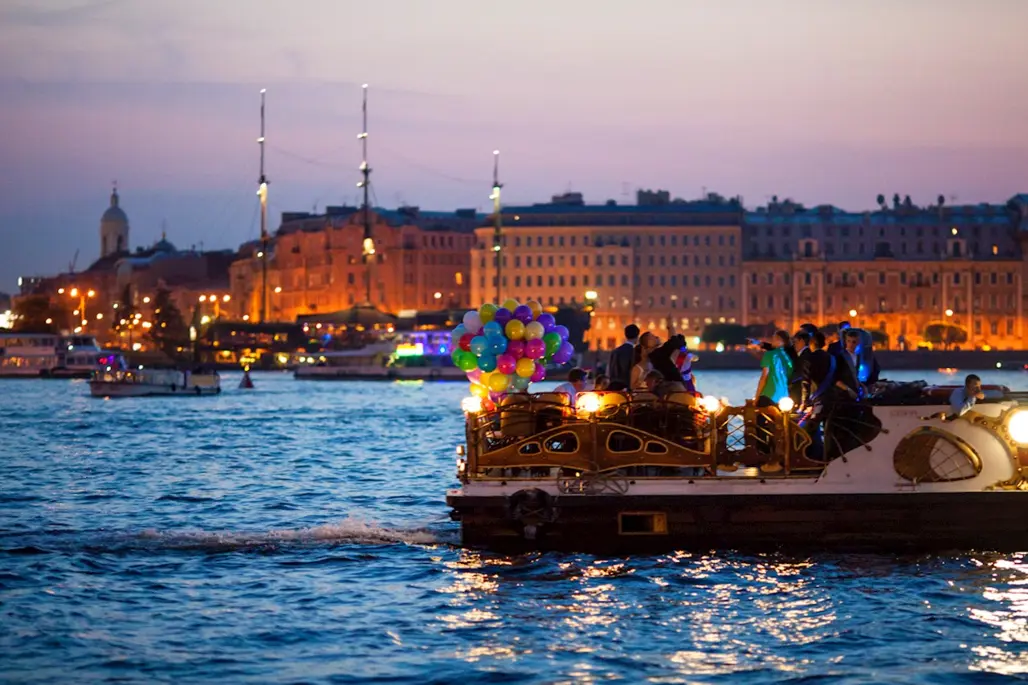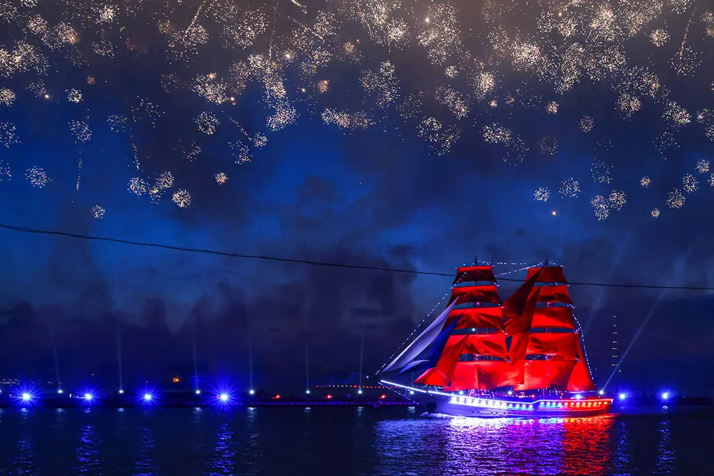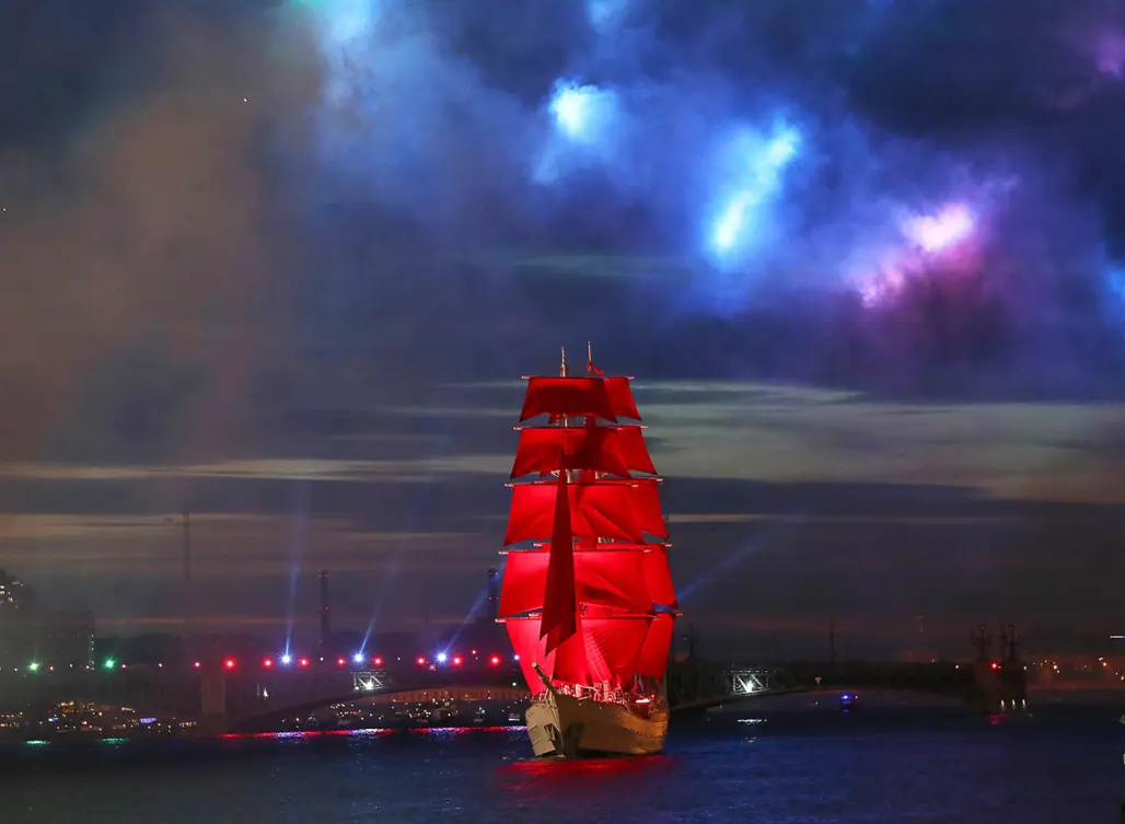 Saint Petersburg nổi tiếng với hiện tượng “Đêm Trắng” thời điểm bầu trời gần như không tối hẳn, tạo nên không gian mờ ảo, thơ mộng suốt đêm. Khi con thuyền buồm đỏ xuất hiện giữa ánh sáng đặc trưng ấy, toàn bộ khung cảnh trở nên cực kỳ điện ảnh và khó quên đối với du khách.
